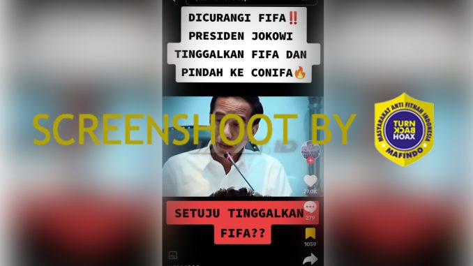 Sebuah akun TikTok membagikan informasi yang mengklaim sepak bola Indonesia meninggalkan FIFA karena dicurangi. Video itu menampilkan cuplikan pidato Presiden Jokowi. Pengunggah menyebut Indonesia bergabung dengan Confederation of Independent Football Associations (Conifa). Faktanya, saat ini Indonesia masih menjadi bagian dari FIFA.