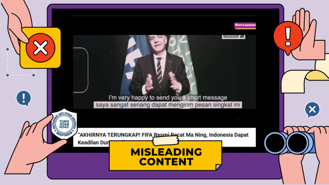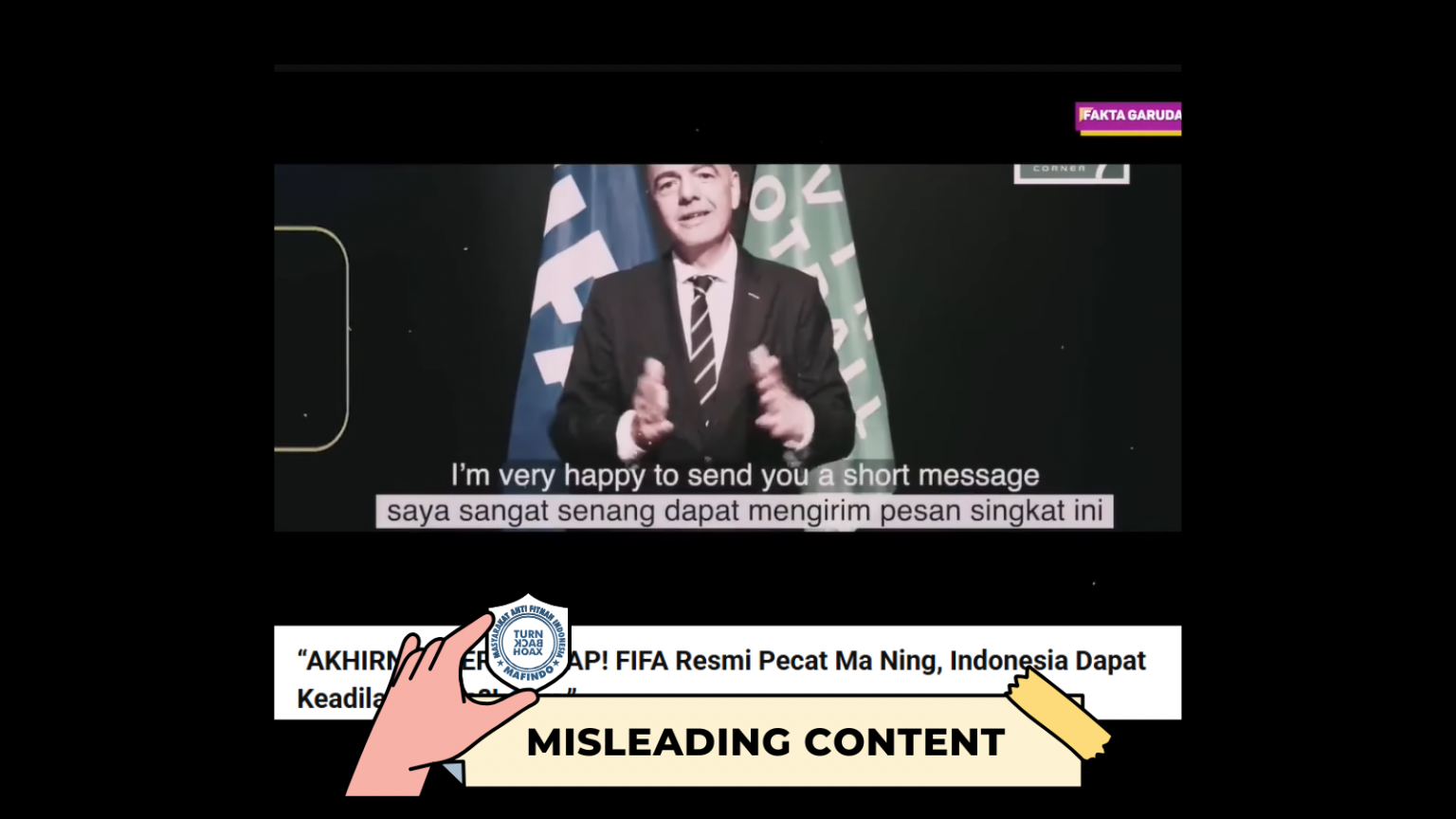 Diketahui, konteks asli video merupakan momen Presiden FIFA Gianni Infantino menyampaikan pesan kepada PSSI yang saat itu akan menggelar kongres luar biasa (KLB) pada 2019. Tidak ditemukan pernyataan apapun mengenai wasit Ma Ning dalam video tersebut.