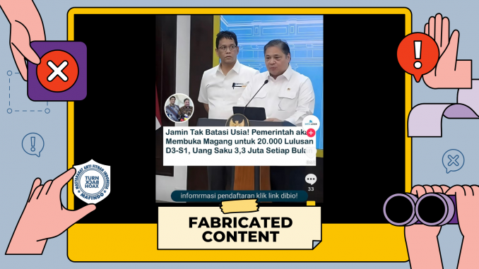 Unggahan berisi tautan “pendaftaran magang berbayar dari pemerintah” yang mengarah ke laman tak resmi itu merupakan konten palsu (fabricated content) untuk modus penipuan.
