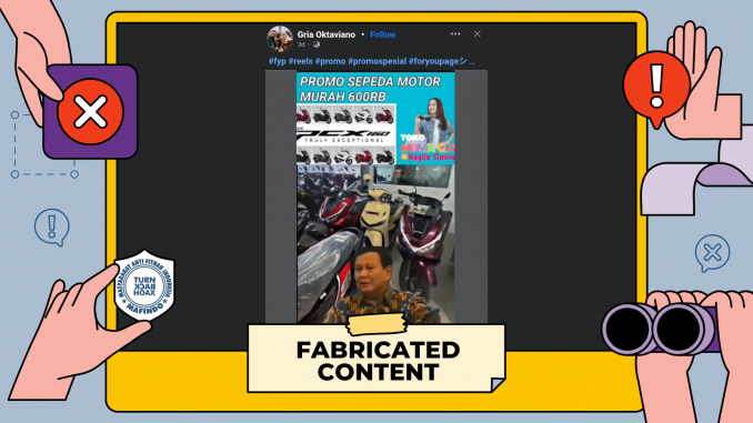 Unggahan video berisi klaim “Presiden Prabowo promosikan program motor murah” merupakan konten palsu (fabricated content).