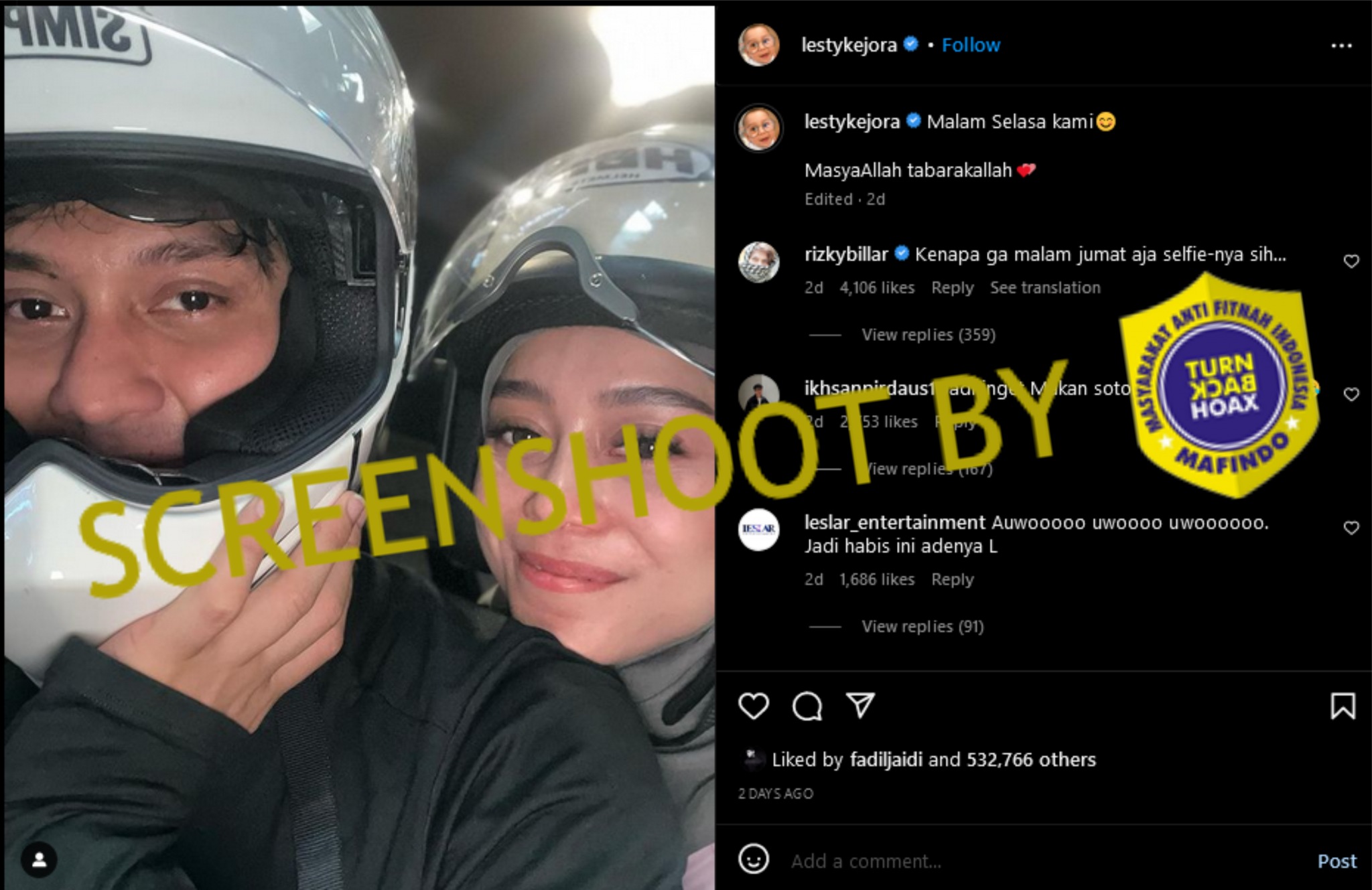 Baru beberapa hari lalu saat artikel ini dibuat, Lesty dan Billar masih terlihat bersama dalam postingan Instagram @lestykejora, tidak ada tanda-tanda keretakan rumah tangga seperti yang dijelaskan dalam gambar thumbnail unggahan tersebut.