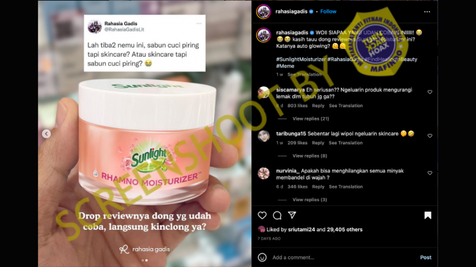 Akun Instagram Rahasia Gadis (@rahasiagadis) mengunggah foto dengan klaim telah menemukan produk pelembab wajah dengan merek Sunlight. Dalam foto tersebut terlihat kemasan jar berwarna merah muda dan putih pada tutupnya, disertai logo Sunlight, serta terdapat keterangan “Rhimno Moisturizer”.
