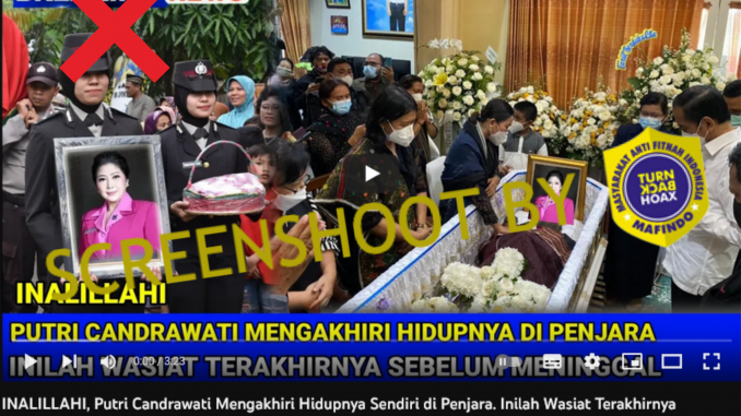 Unggahan video tersebut menarasikan sebuah kalimat pada judul videonya seolah Putri Candrawati telah dikabarkan mengakhiri hidupnya di penjara, disertai cuplikan dari beberapa foto duka yang seakan membenarkan bahwa yang ada dalam peti mati adalah benar Putri Candrawati.