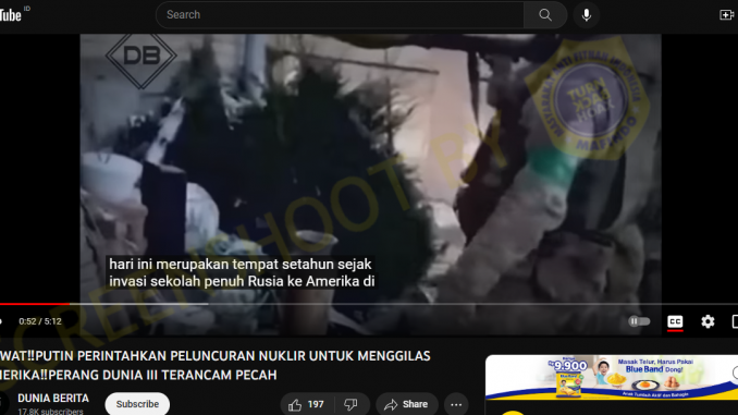 Channel YouTube DUNIA BERITA (https://www.youtube.com/@duniaberita2029) pada 8 Maret 2023 mengunggah video dengan judul yang mengklaim bahwa Presiden Rusia, Vladimir Putin, akan mengerahkan rudal nuklir Rusia ke Amerika. Dalam unggahan tersebut, narator menyebutkan jika Putin telah memperingatkan Amerika mengenai Moskow yang akan melanjutkan uji coba nuklir miliknya.