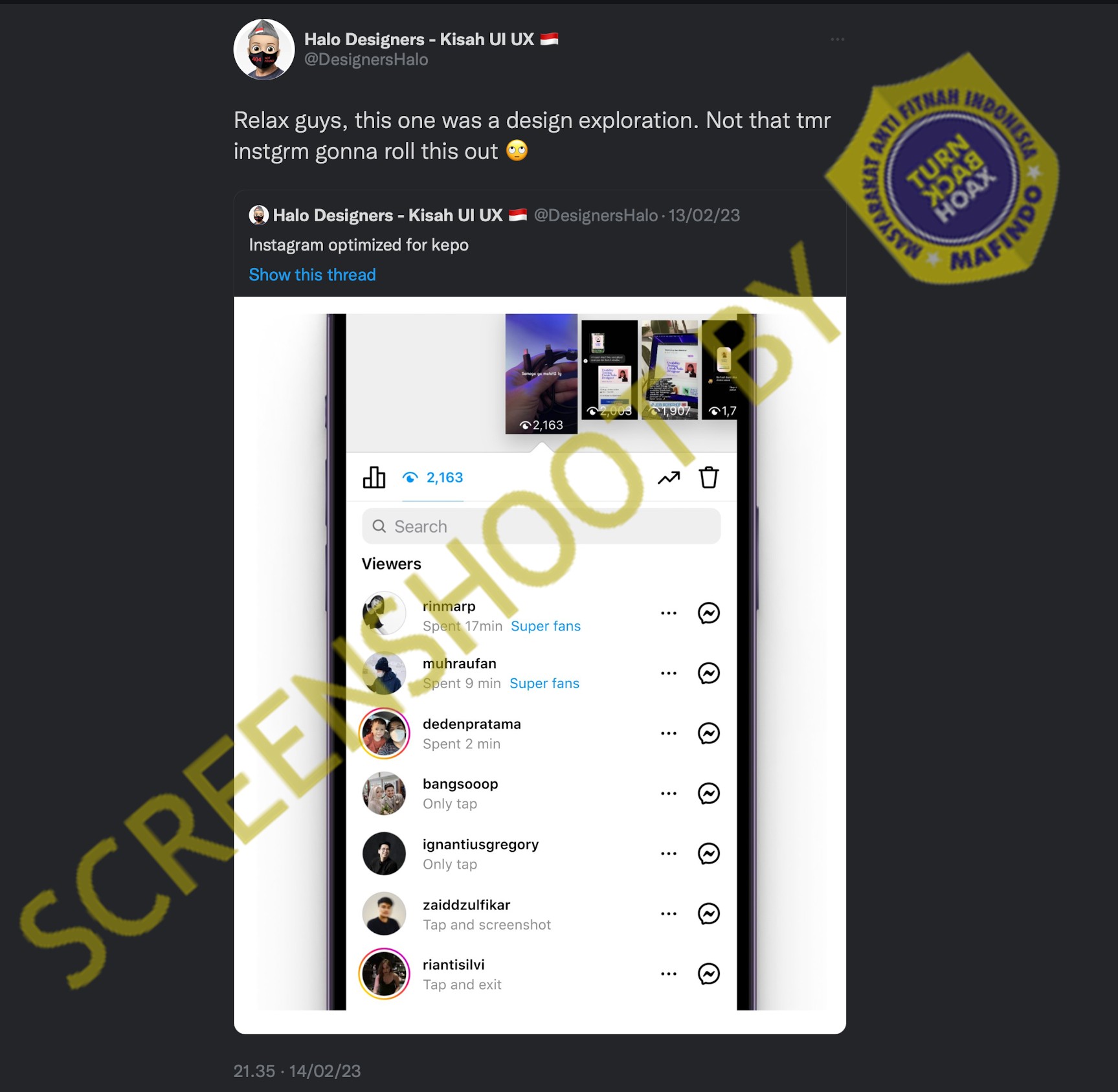 Akun Twitter @DesignerHalo membagikan cuitan dengan melampirkan tangkapan layar dengan klaim fitur terbaru Instagram Story. Dalam cuitan tersebut memperlihatkan fitur baru Instagram Story yaitu label super fans. Selain bisa mengetahui siapa dan berapa lama pengikut melihat Instagram Story, fitur tersebut juga memperlihatkan siapa yang mengambil tangkapan layar Instagram Story.