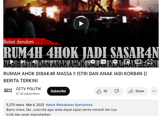 Sebuah kanal Youtube bernama CCTV POLITIK mengunggah video berdurasi 8 menit dengan judul “RUMAH AHOK DIBAK4R MASSA !! ISTRI DAN ANAK JADI KORB4N || BERITA TERKINI”.