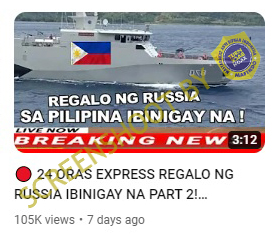 Beredar video dari channel youtube Ella Vloggs dengan narasi yang mengklaim bahwa Rusia telah memberikan hadiah berupa kapal perang kepada Filipina.