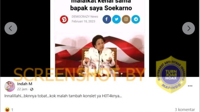 Akun Facebook Indah M pada 6 Maret 2023 pukul 00.10 memposting sebuah gambar tangkapan layar artikel DEMOCRAZY News dengan judul “Megawati saya sudah Jelas masuk surga malaikat kenal sama bapak saya Soekarno”.