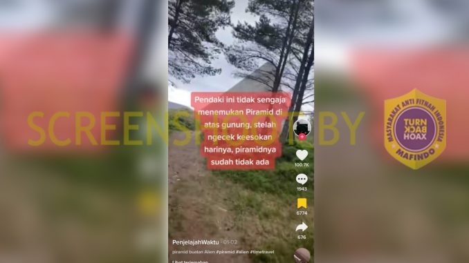 Sebuah video TikTok menunjukkan ada piramida tersembunyi di tengah hutan yang diklaim dibangun oleh alien. Video yang telah ditonton 3,2 juta kali itu berlatar belakang musik misteri. Pengunggah menuliskan narasi dalam video “Pendaki ini tidak sengaja menemukan Piramida di atas gunung, setelah ngecek keesokan harinya, piramidanya sudah tidak ada.”