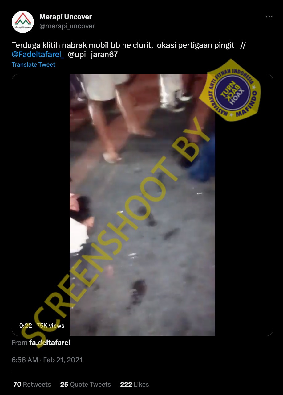 Sebuah akun Twitter mengunggah sebuah video yang diberi keterangan “Mereka menyebutnya sebagai "Gunung Api Kiamat" untuk gunung Merapi meletus di pulau Jawa”.
