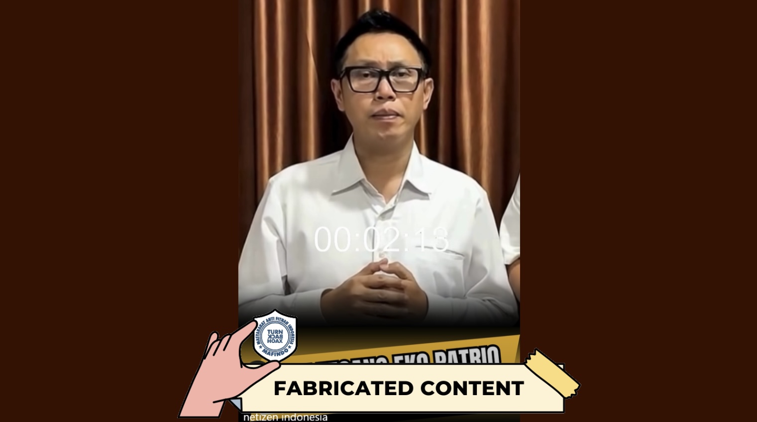Unggahan video berisi klaim “Eko Patrio bagi-bagi uang di laman judi sebagai bentuk permohonan maaf” merupakan konten palsu (fabricated content).
