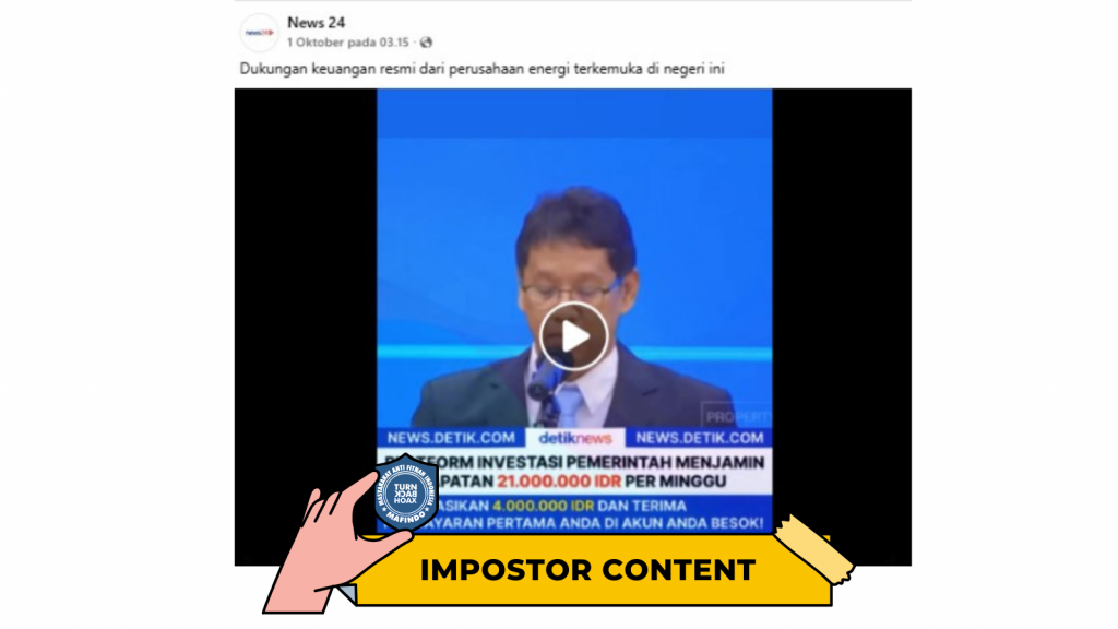 Unggahan berisi klaim “Menkeu Purbaya promosikan platform investasi” itu merupakan konten palsu (imposter content)