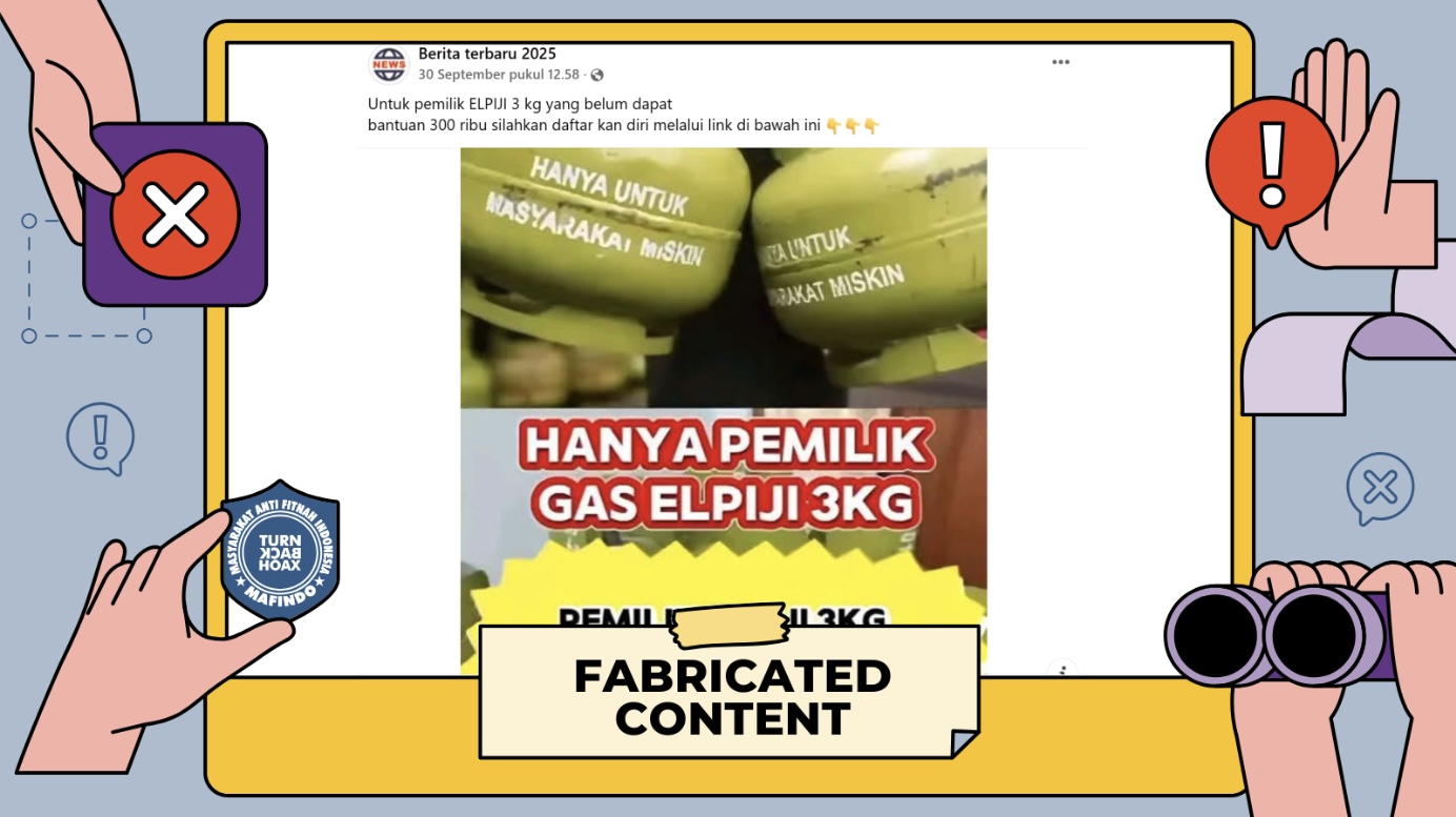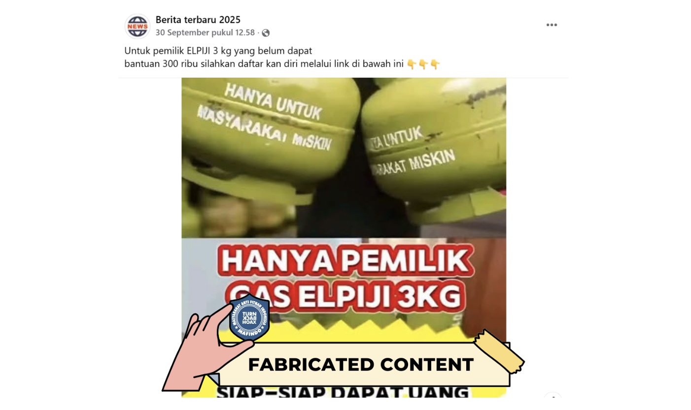 Unggahan berisi tautan “pendaftaran bantuan tunai untuk pemilik gas LPG 3 kg” adalah konten palsu (fabricated content).