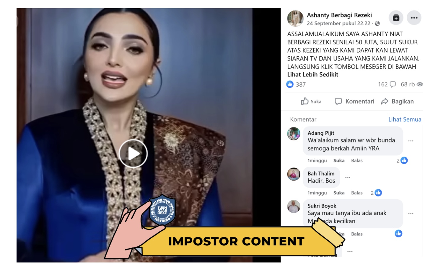 Unggahan video berisi klaim “Ashanty bagi-bagi uang” merupakan konten tiruan (impostor content) untuk modus penipuan.