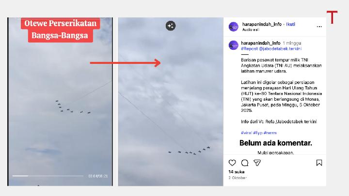 Tempo memverifikasi konten itu lewat pencarian gambar terbalik Google dan membandingkannya dengan sumber kredibel. Hasilnya, video yang beredar merupakan bagian dari latihan tempur TNI AU menjelang HUT TNI yang diperingati 5 Oktober 2025 di Jakarta.