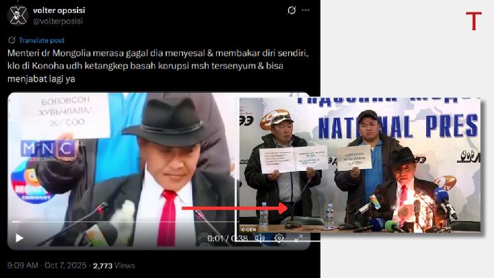 SEBUAH video beredar di X atau Twitter [arsip] dan Threads [arsip] dengan klaim seorang menteri di Mongolia membakar diri karena gagal menjalankan tugas.