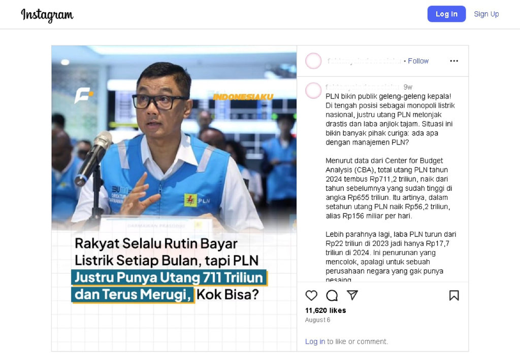 Salah satu konten klaim tersebut disebarkan oleh akun Instagram @faktanyaindonesiaku (arsip) pada Rabu (6/8/2025). Dalam visual unggahannya, ia menyebut PLN terus merugi, padahal rakyat selalu rutin membayar listrik setiap bulan.