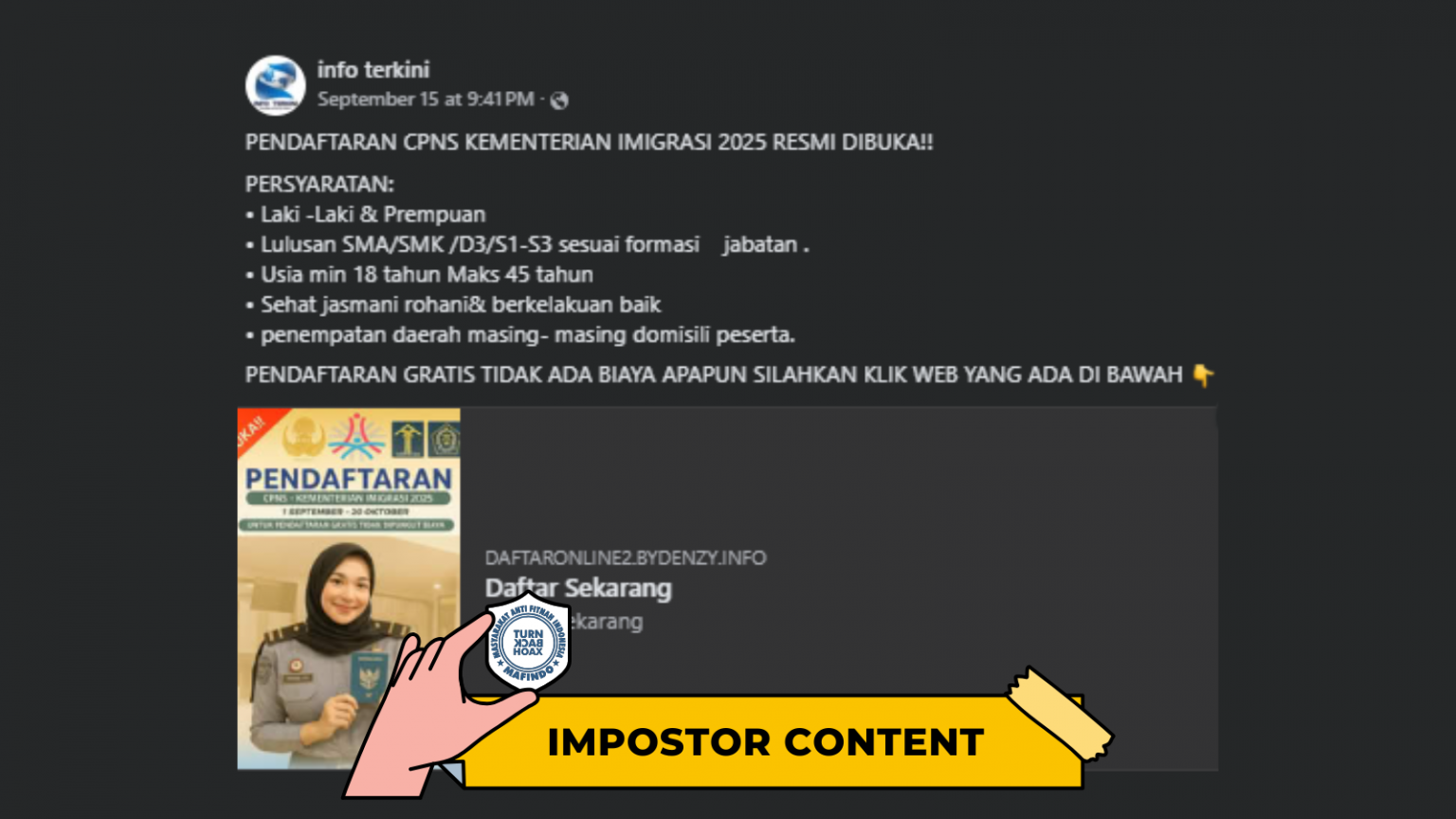 Unggahan berisi tautan “pendaftaran CPNS Kementerian Imigrasi” yang mengarah ke laman tak resmi itu merupakan konten tiruan (impostor content).