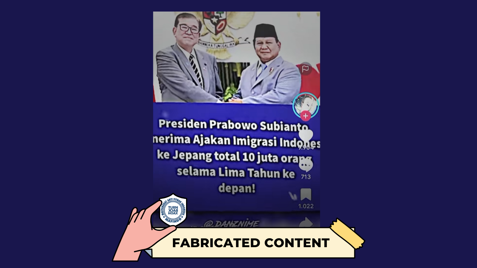 Unggahan dengan narasi “Prabowo terima tawaran Jepang soal 10 juta imigran Indonesia” merupakan konten palsu (fabricated content).