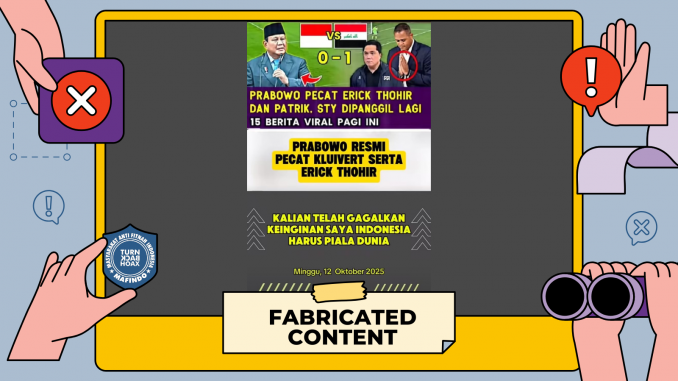 Unggahan berisi klaim “Prabowo resmi pecat Kluivert dan Erick Thohir” merupakan konten palsu (fabricated content).