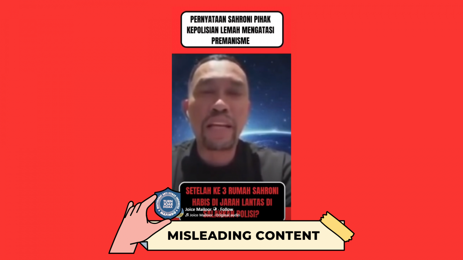 Unggahan video berisi klaim “Sahroni salakan polisi usai rumahnya dijarah” merupakan konten yang menyesatkan (misleading content).