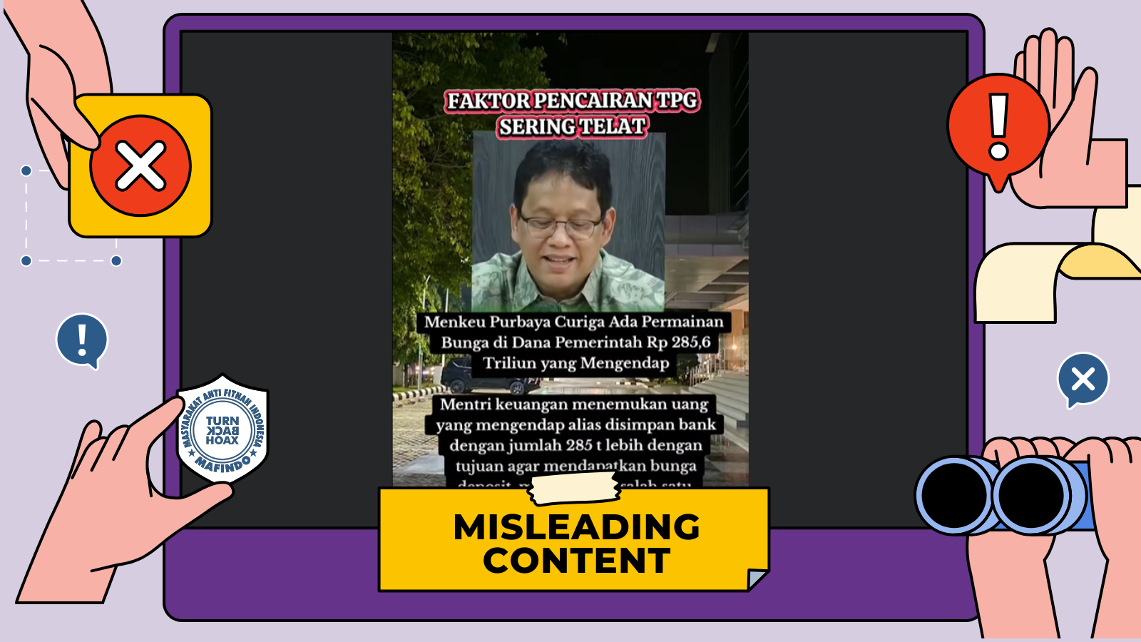Unggahan berisi klaim “Menkeu Purbaya curiga permainan bunga Rp285,6 triliun jadi penyebab TPG telat” adalah konten yang menyesatkan (misleading content).