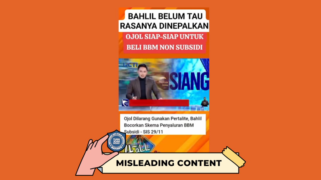 Kementerian ESDM menegaskan bahwa pengemudi ojek online (ojol) masih diperbolehkan menggunakan BBM jenis Pertalite, dan hingga saat ini belum ada kebijakan pelarangan. Unggahan dengan narasi “Ojol dilarang gunakan pertalite” merupakan konten yang menyesatkan (misleading content).
