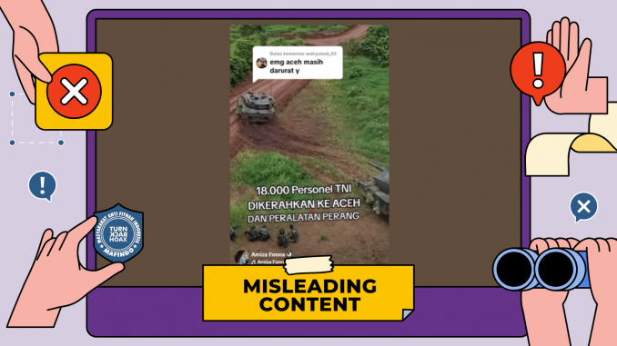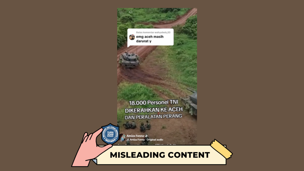 Faktanya, video tersebut adalah latihan Yonkav1 di Pusat Latihan Tempur Kodiklatad Baturaja, Sumatera Selatan. Unggahan dengan narasi “video pengiriman 18.000 personel TNI ke Aceh” merupakan konten yang menyesatkan (misleading content).