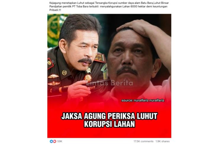 Dalam unggahan itu juga ditampilkan foto Jaksa Agung Sanitiar Burhanuddin bersama Luhut, disertai tulisan “Jaksa Agung Periksa Luhut Korupsi Lahan”.