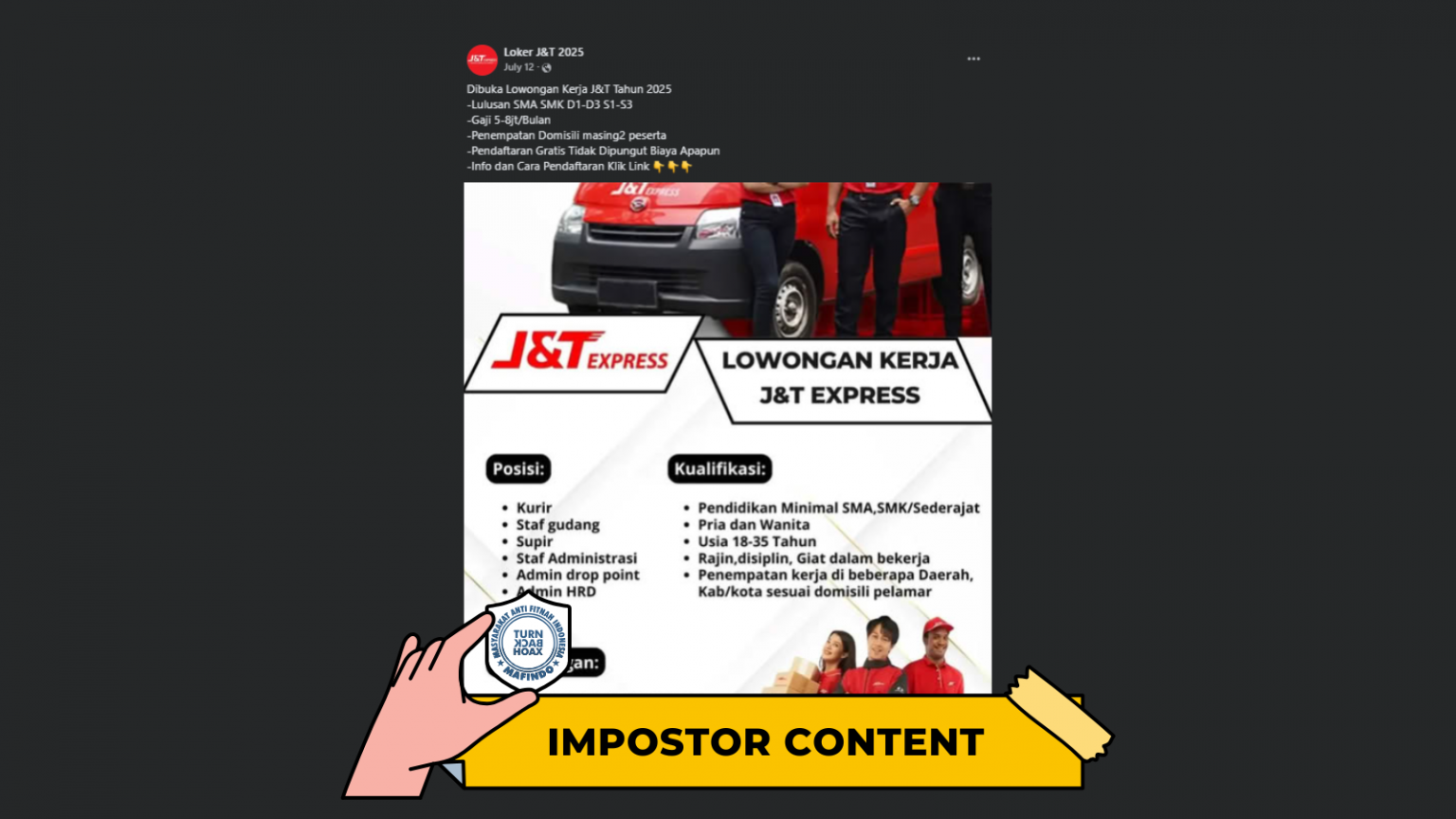 Unggahan berisi tautan โpendaftaran lowongan kerja J&T Expressโ yang mengarah ke laman tak resmi itu merupakan konten tiruan (impostor content).