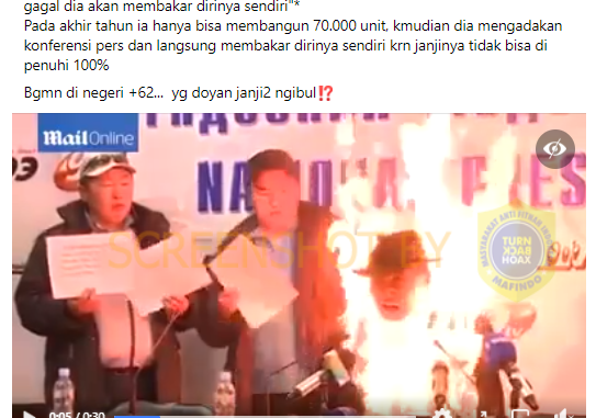 Akun Facebook bernama Auliah Mahfudz mengunggah video yang menunjukkan seseorang yang membakar dirinya saat tengah mengadakan konferensi media dan terlihat orang-orang disekitarnya berusaha memadamkan api di tubuh pria itu. Akun itu mengklaim bahwa pria yang mebakar dirinya tersebut adalah Menteri Pekerjaan Umum Mongolia karena telah mengingkari janji untuk membangun 100 ribu unit rumah bagi para buruh berpenghasilan rendah.