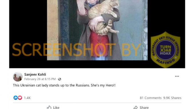 Akun Facebook Sanjeev Kohli mengunggah foto yang memperlihatkan seorang nenek dengan kucingnya yang memberikan jari tengah. Foto tersebut diklaim sebagai seorang nenek dari Ukraina yang mengekspresikan kebenciannya terhadap tentara Rusia.