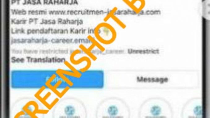 Beredar sebuah akun karir PT Jasa Raharja dengan nama pengguna jasaraharja_career. Akun tersebut juga mencantumkan situs yang akan mengarahkan pengguna ke formulir online dan mengharuskan pengguna untuk mengisikan data pribadi.