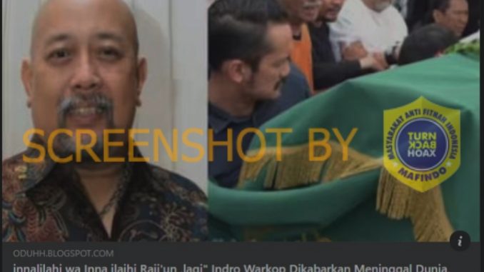 Beberapa waktu lalu akun Facebook bernama Agus Saputra membagikan sebuah artikel dari situs ODUHH.BLOGSPOT.COM pada grup Facebook bernama Ceramah Ustaz Syamsul Debat 2021 terkait informasi salah satu komedian senior Indonesia yang dikenal dengan nama Indro Warkop yang dikatakan telah meninggal dunia.