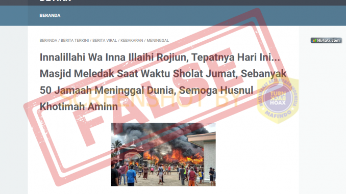 Berdasarkan hasil penelusuran, adanya foto yang memperlihatkan suasana kebakaran dan orang-orang berkumpul di sekitar lokasi kebakaran yang diklaim sebagai masjid yang meledak waktu salat Jumat dan sebanyak 50 jamaah meninggal merupakan klaim yang salah.