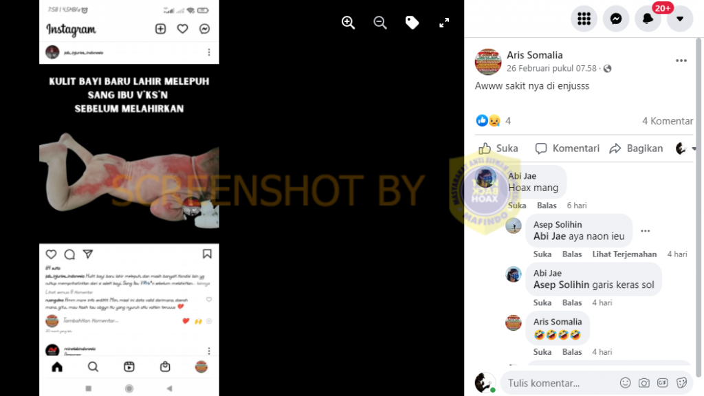 Akun Facebook bernama Aris Somalia mengunggah tangkapan layar dari postingan di Instagram berupa foto yang mengklaim kulit bayi baru lahir melepuh setelah sebelumnya sang ibu menerima vaksin covid-19 saat hamil.