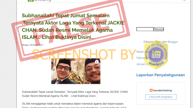 Subhanallah! Tepat Jumat Semalam ,Ternyata Aktor Laga Yang Terkenal JACKIE CHAN. Sudah Resmi Memeluk Agama ISLAM… Lihat Buktinya Disini…” yang terbit di situs bacanewss[dot]xyz pada 6 Maret 2022. Artikel ini juga menampilkan foto Jackie Chan yang mengenakan peci hitam.
