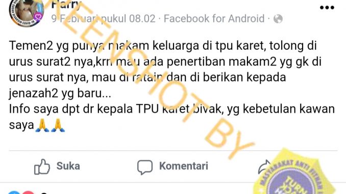 Informasi Palsu. Telah dikonfirmasi secara langsung oleh Dinas Pertamanan dan Hutan Kota DKI Jakarta, melalui akun Instagram resminya @tamanhutandki, bahwa tidak ada penertiban makan di TPU Karet Bivak.