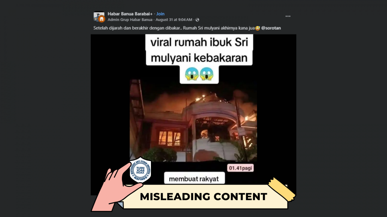 Unggahan foto berisi klaim “rumah Sri Mulyani dibakar massa” adalah konten yang menyesatkan (misleading content).
