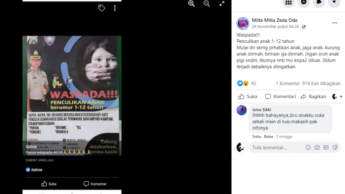 Akun Facebook bernama Milta Milta Zeda Ode mengunggah sebuah poster berisi himbauan waspada penculikan anak berumur 1-12 tahun dengan beberapa modus operandi seperti penjual, pengemis, ibu hamil, dan orang gila. Dalam poster tersebut juga diklaim bahwa himbauan tersebut dikeluarkan oleh Polresta Sidoarjo.
