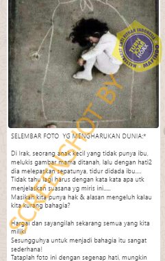 Beredar pesan berantai Whatsapp berupa foto dengan narasi yang menyebutkan bahwa bocah dalam foto merupakan anak asal Irak piatu (tidak memiliki ibu). Dikatakan dalam narasi bahwa bocah tersebut melukis gambar ibunya di tanah dan tertidur di atas dada gambar ibunya tersebut.