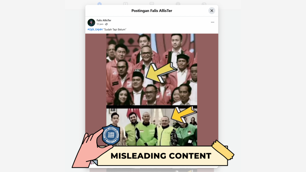 Kokok Herdhianto Dirgantoro, orang yang ada di foto bersama anggota Partai Solidaritas Indonesia (PSI) menyatakan dia bukanlah orang yang ada di foto pengemudi ojek online (ojol) bersama Wakil Presiden Gibran Rakabuming Raka. Unggahan berisi klaim “anggota Partai Solidaritas Indonesia (PSI) adalah pengemudi ojol yang bertemu dengan Wapres Gibran” adalah konten yang menyesatkan (misleading content).