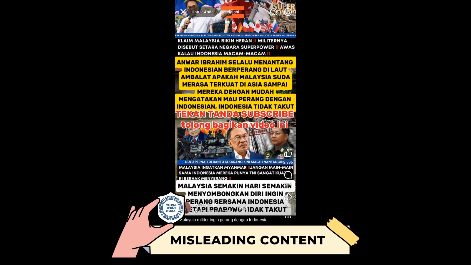 Unggah berisi klaim “Perdana Menteri Malaysia Anwar Ibrahim selalu menantang Indonesia berperang di Laut Ambalat” adalah konten yang menyesatkan (misleading content). Anwar Ibrahim, sebagai Perdana Menteri Malaysia, tidak pernah menyatakan secara terbuka atau resmi tantangan perang kepada Indonesia.