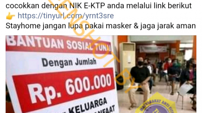 Akun Facebook bernama Tia Johar mengunggah narasi dan gambar tentang Bantuan Sosial Tunai sekaligus menyertakan sebuah link bantuan yang besarannya RP600.000 untuk warga yang mempunyai e-KTP. Postingan yang diunggah pada 5 September 2021 pukul 21.48 juga menyertakan sebuah link untuk mengecek apakah mendapat bantuan atau tidak.