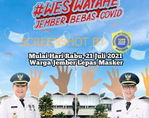 Beredar sebuah infografis pada salah satu komentar di grup Facebook Info Jember oleh akun Jenny II (https://m.facebook.com/muhammadfajar.sudrajat.9?fref=nf) yang mengatakan bahwa pada hari Rabu 21 Juli 2021 Warga Jember dapat melepas masker. Infografis tersebut juga memuat lambang dari Pemerintah Kabupaten Jember dan juga menyertakan foto Bupati dan Wakil Bupati Jember.
