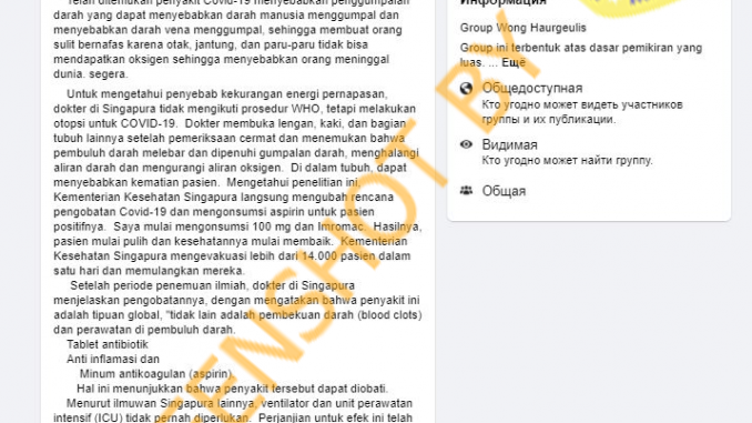 FAKTA – Singapura belum melakukan otopsi seperti itu. Pesan tersebut menyatakan informasi palsu mengenai patofisiologi infeksi covid-19, yang tidak didukung oleh bukti saat ini. Versi sebelumnya dari pesan yang beredar ini, yang menyebutkan Rusia dan bukan Singapura, juga telah terungkap sebagai tidak benar.