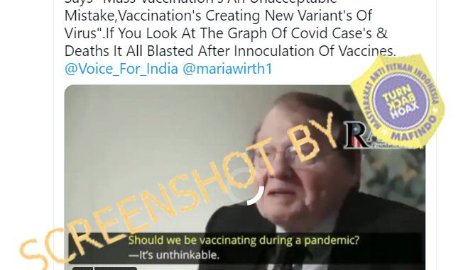 “Postingannya juga disertai video berdurasi 45 detik sebagai bukti. Dalam video 45 detik tersebut, ahli virologi dari Prancis Luc Montagnier menyatakan jika vaksinasi dapat menyebabkan varian virus Corona baru, Luc juga mengklaim bahwa tingginya vaksinasi di sebuah negara berbanding lurus dengan kenaikan jumlah pasien terinfeksi COVID-19.