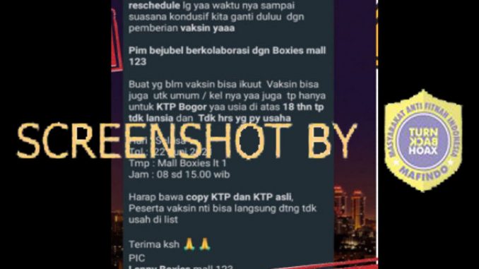 Beredar pesan chat di WhatsApp yang menginformasi adanya vaksinasi massal gratis di Kota Bogor pada 22 Juni 2021, bertempat di Mall Roxies lt 1, pada pukul 08.00 – 15.00. Syarat vaksinasi massal gratis tersebut adalah bagi warga umum berusia 18 tahun ke atas, bukan lansia, dan tidak harus memiliki usaha. Peserta juga bisa langsung datang ke tempat yang diinfokan dengan membawa fotocopy KTP dan KK asli, serta tidak perlu melalui list.