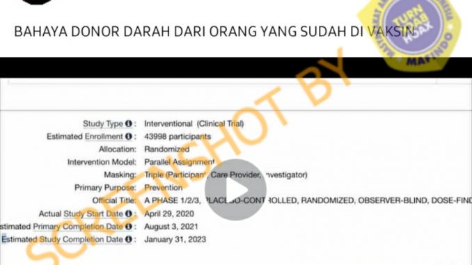 Beredar sebuah video melalui media sosial Facebook yang menyatakan bahwa donor darah dari orang yang telah diberi vaksin Covid-19 adalah berbahaya. Hal ini karena ribuan orang telah meninggal akibat disuntik vaksin, sehingga secara langsung juga dapat mempengaruhi orang yang menerima donor darah dari mereka. Video ini menjelaskan bahwa vaksin yang disuntikkan kepada masyarakat adalah vaksin yang berbahaya karena masih dalam tahap uji coba.