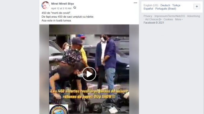 Berdasarkan artikel periksa fakta tempo.co, video tersebut berlokasikan di Venezuela pada saat aksi unjuk rasa mahasiswa kedokteran dari Universidad Central de Venezuela yang menggunakan properti berupa beberapa kantong jenazah berisikan kertas sebagai bentuk protes banyaknya tenaga kesehatan yang meninggal karena Covid-19 serta terbatasnya vaksin Covid-19 untuk tenaga kesehatan. Aksi unjuk rasa ini juga diliput oleh media radio Caracas dan stasiun televisi El Pitazo pada 6 April 2021 dengan beberapa foto dan video yang menampilkan hal yang serupa dengan video yang diklaim adalah 450 kantong jenazah Covid-19 berisikan kertas.